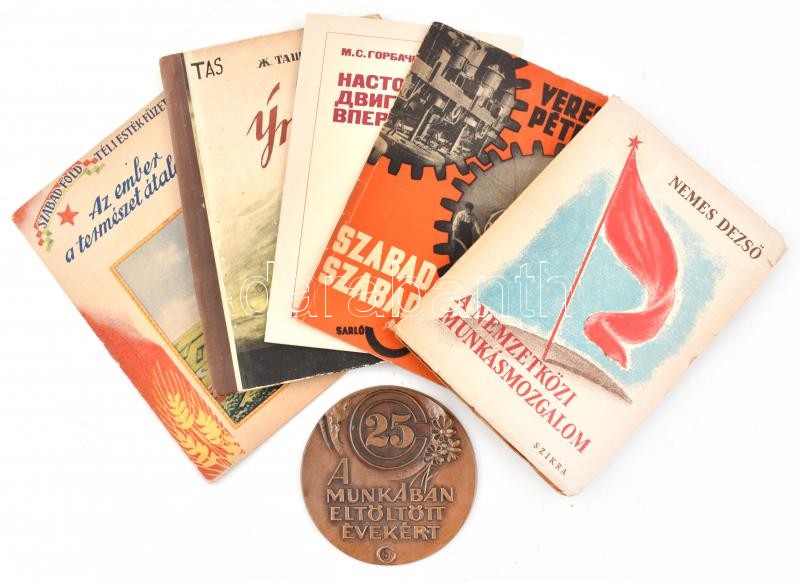 5 db szocialista kiadvány (Nemes Dezső: A nemzetközi munkásmozgalom, Az ember a természet átalakítója, Veres Péter: Szabad ország, szabad munka, stb.) + A munkában eltöltött évekért plakett, d: 9,5 cm