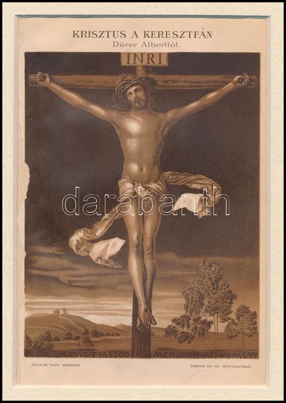 cca 1898 Albrecht Dürer: Krisztus a keresztfán, Pallas Nagy Lexikon színes illusztrációja, litográfia, paszpartuban, papírlapra ragasztva, a szélén kis hiánnyal, 20x14 cm