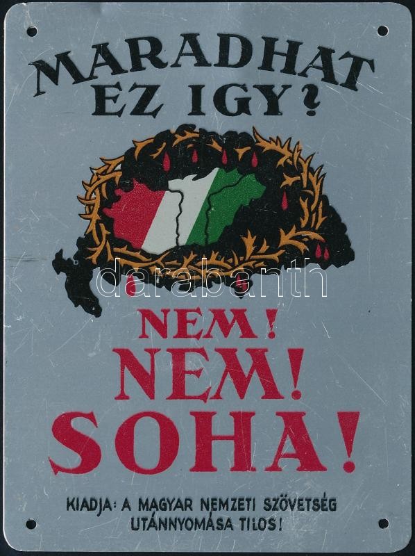 cca 1930 "Maradhat ez így? Nem, nem, soha!" Magyar Nemzeti S... https://www.darabanth.com/de/377-Fernauktion/377.0/Kunst-Dokumente-andere-Sammelgebiete/Historische-Dokumenten-Handschriften~19/cca-1930-Maradhat-ez-igy-Nem-nem-soha-Magyar-Nemzeti-Szovetseg-irredenta-fem-tabla-kis-d~II2217206