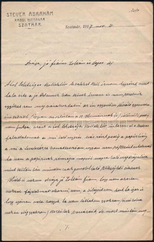 1917 Szatmár, Steuer Ábrahám rabbi, saját kezű levele / Ábrahám Steuer... https://www.darabanth.com/de/377-Fernauktion/377.0/Kunst-Dokumente-andere-Sammelgebiete/Judaica~26/1917-Szatmar-Steuer-Abraham-rabbi-sajat-kezu-levele-Abraham-Steuer-rabbis-letter~II2215860