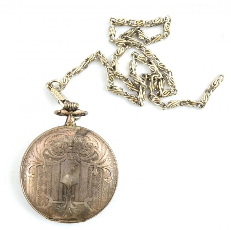 Beschreibung: Oscar Moser ezüst (Ag) zsebóra szecessziós díszítéssel. fém lánccal, javításra szoruló szerkezettel
