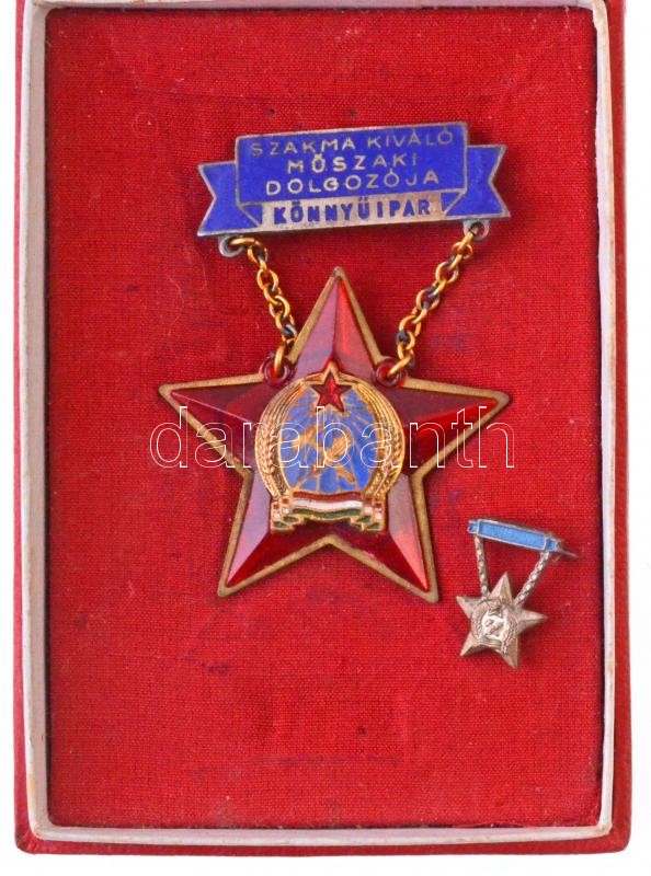 ~1950. "A Szakma Kiváló Műszaki Dolgozója - Könnyűipar" zománcozott Rákosi-címeres jelvény hátlapon gravírozott "66119" sorszámmal, miniatűrrel, eredeti tokban T:2