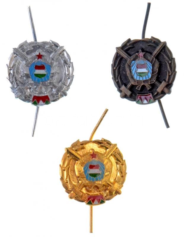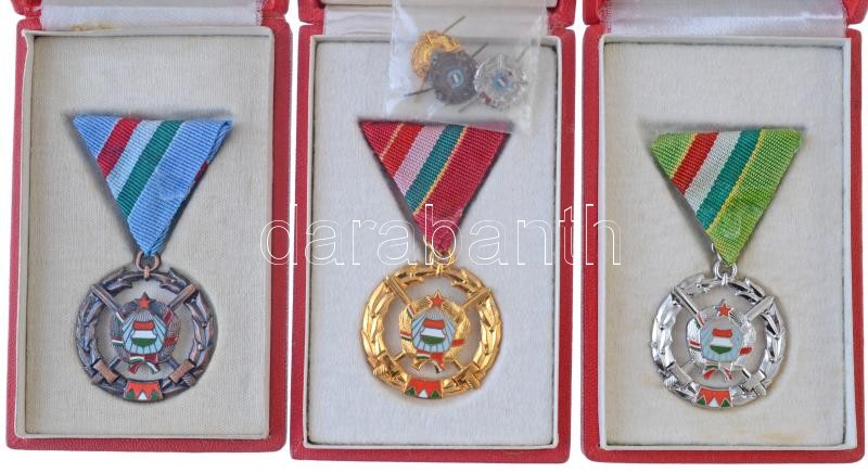 1979. "Fegyverbarátságért Érdemérem" arany, ezüst és bronz fokozata, zománcozott, aranyozott, ezüstözött és bronz kitüntetések miniatűrökkel, eredeti tokokban T:1 Hungary 1979. "Medal for Weapon Friendship" Golden, Silver and Bronze Grade" enamelled, gold plated, silver plated and bronze decorations with miniatures in original cases C:UNC NMK 717-719.