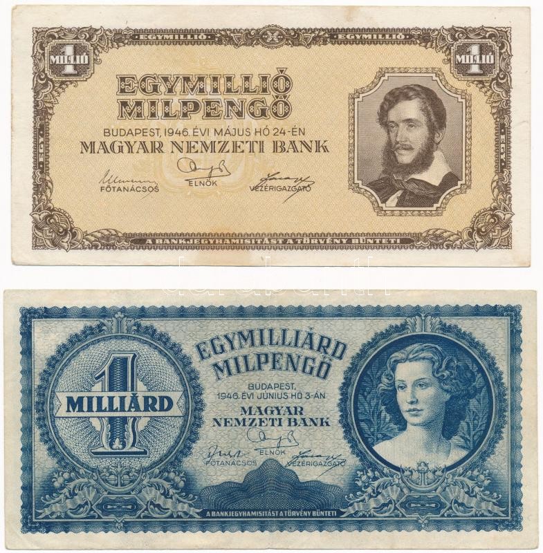 1946. 1.000.000MP + 1.000.000.000MP T:II,III Adamo P31, P34 https://www.darabanth.com/de/377-Fernauktion/377.0/Numismatik/Ungarische-Banknoten~1500007/1946-1000000MP-plus-1000000000MP-TII-III-Adamo-P31-P34~II2193642