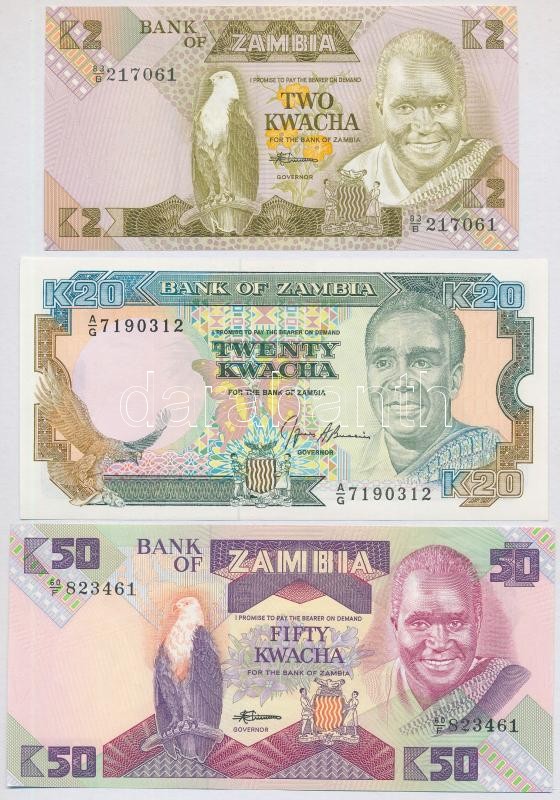 Zambia 1980-1988. 2 Kwacha + 1989-1991. 20 Kwacha + 1986-1988. 50 Kwacha C:UNC Krause 24,32,28