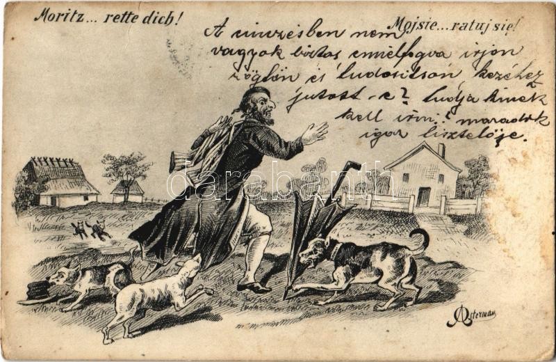 Beschreibung: 1908 Moritz... rette dich! / Mojsie... ratuj sie! / Jewish humour, Judaica art postcard. W.k.p. - A.S. Kraków Deposé 1907. - 3. s: Astermann (EK)
