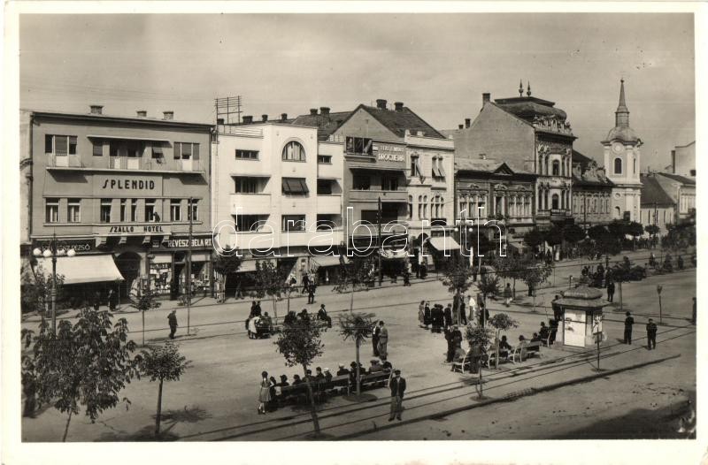 Marosvásárhely, Targu Mures; Széchenyi tér, Splendid szálló, Kertész Rezső, Révész Béla rt., Hudák Béla, Fekete Mihály, Tóth István, Rácz, Hübner és József Emil üzlete / square with shops, hotel