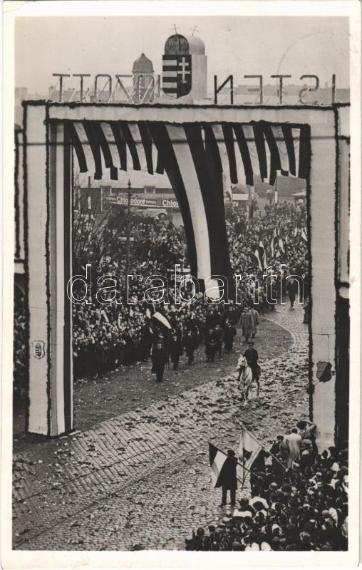 1938 Kassa, Kosice; bevonulás, Horthy Miklós, "Isten hozott"... https://www.darabanth.com/de/378-Fernauktion/378.0/Ansichtskarten/Slowakei~1500007/1938-Kassa-Kosice-bevonulas-Horthy-Miklos-Isten-hozott-diszkapu-magyar-cimer-entry-of-t~II2234263
