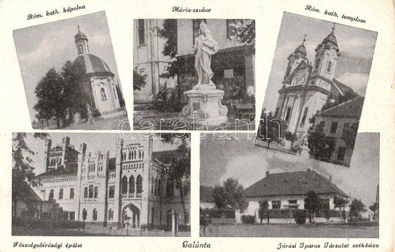 Galánta, Római katolikus templom és kápolna, Mária szobor, Főszolgabírósági épület (Esterházy kastély), Járási Iparos Társulat székháza / Catholic church and chapel, Virgin Mary statue, constable's office (Esterházy castle), district industrial company's headquarters