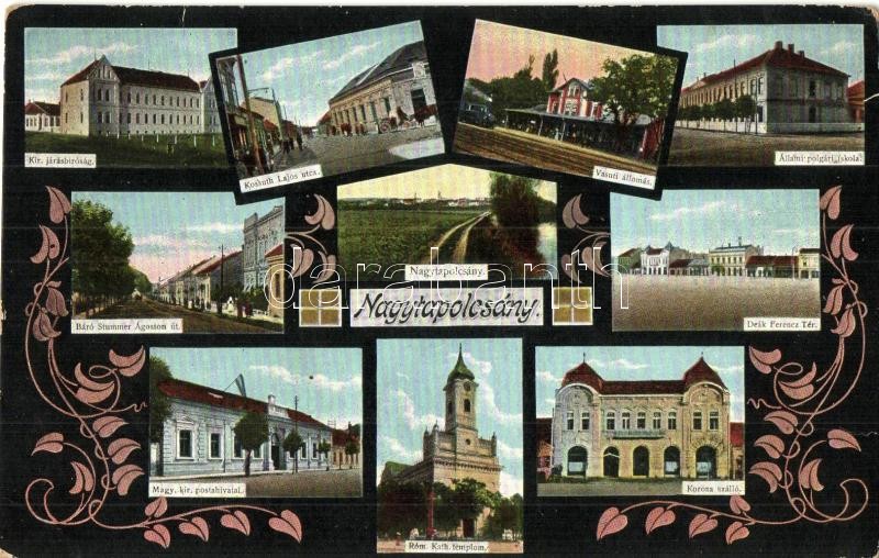 Nagytapolcsány, Topolcany; mozaiklap: Kir. Járásbíróság, Kossuth Lajos utca, Vasútállomás, gőzmozdony, Állami polgári iskola, Báró Stummer Ágoston út, Deák Ferenc tér, Magy. kir. posta hivatal, Római katolikus templom, Korona szálloda. Platzko Gyula kiadása / multi-view postcard: court, street views, railway station, locomotive, squares, villas, school, post office, Catholic church, hotel. Art Nouveau, floral (EK)