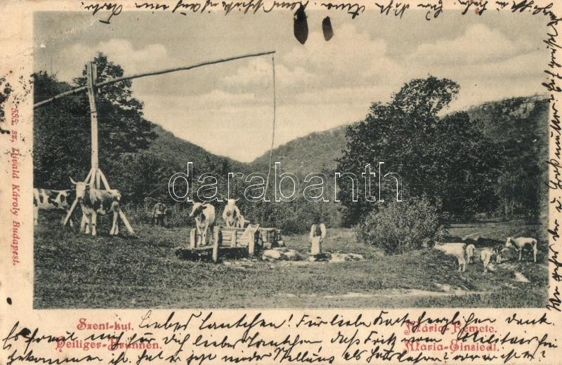 Beschreibung: 1902 Budapest II. Máriaremete, Szentkút, tehenek a gémeskútnál. Divald Károly 555. sz. (EB)