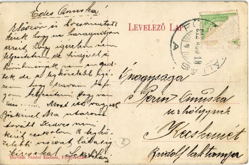 Beschreibung: 1912 Fülöpszállás, Községháza, utcakép a Református templommal, Halastó csónakázókkal. Kiadja Horváth Sándor (EK)