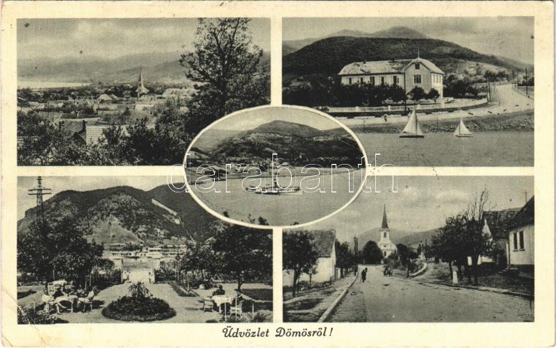 Beschreibung: 1942 Dömös, mozaiklap, gőzhajó, vitorlások, utca, park. Kládek József kiadása (EK)