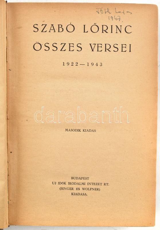Szabó Lőrinc összes versei. 1922-1943. Bp.,1944,Új Idők,(Singer és Wol... https://www.darabanth.com/de/378-Fernauktion/378.0/Bucher/Bucher-Andere-kuriositaten~1000018/Szabo-Lorinc-osszes-versei-1922-1943-Bp-1944-Uj-Idok-Singer-es-Wolfner-Masodik-kiadas~II2160085