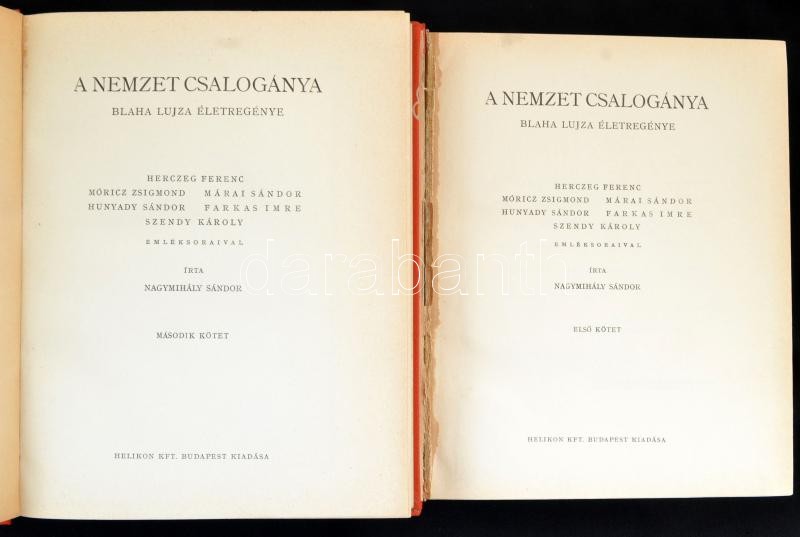 Nagymihály Sándor: A nemzet csalogánya I-II. Blaha Lujza életregénye Herczeg Ferenc, Móricz Zsigmond, Márai Sándor, Hunyady Sándor, Farkas Imre és Szendy Károly, valamint Horthy Miklós emléksoraival. Bp.,(1926), Helikon. Gazdag fekete-fehér és színes illusztrációkkal, mellékletekkel. Kiadói, népies motívumokkal díszített, egészvászon-kötésben, az első kötetben hiányzó szennylapokkal, de egyébként jó állapotban.