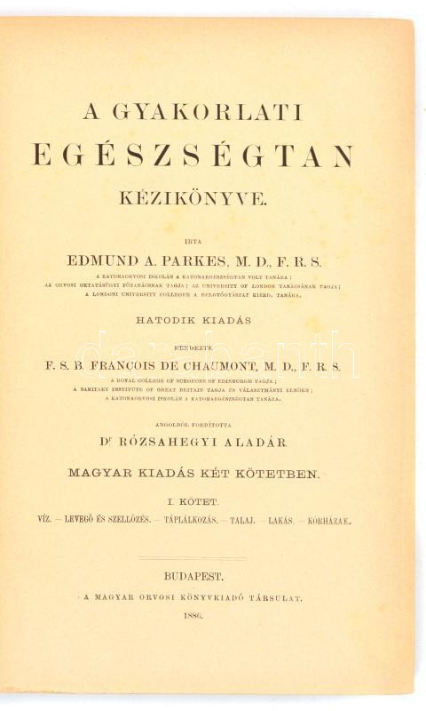 [Edmund Alexander Parkes (1819-1876)]: Edmund A. Parkes: Gyakorlati egészségtan. I-II. köt. I. köt. : VÃz - levegÅ‘ és szellÅ‘zés - táplálkozás - talaj - lakás -kórházak. II. köt.: Ürülékek - fűtés - testgyakorlás - ruházat - éghajlat - meterológia - egyéni egészségügy - halottak - járványok - statisztika - katonaegészségtan. Rendezte: Francois de Chaumont. Ford.: Dr. Rózsahegyi Aladár. Magyar Orvosi Könyvkiadó Társulat L.,LI köt. Bp., 1886, Magyar Orvosi Könyvkiadó Társulat, XX+569+I-VIII (VIII 1-2)+6 p.; IX+588 p. Rengeteg szövegközti illusztrációval. Kiadói aranyozott egészvászon-kötés, márványozott lapélekkel, kopott borÃtóval.