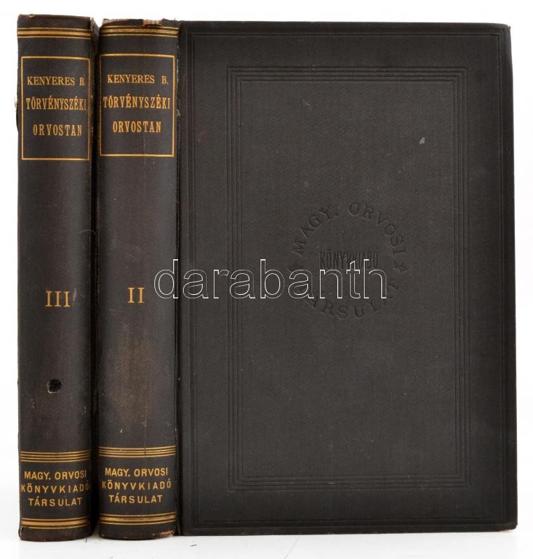 Kenyeres Balázs: Törvényszéki orvostan. II.-II. Köt. Magyar Orvosi Könyvkiadó-Társulat Könyvtára CV kötet. Bp., 1910-1911., Magyar Orvosi Könyvkiadó Társulat, VII+508 p.+IV t., VII+530+1 p.+V t. Gazdag szövegközti képanyaggal illusztrált. Kiadói aranyozott egészvászon-kötés, Gottermayer-kötés, kissé kopott borítókkal, a kötetek gerincén sérülésnyommal.
