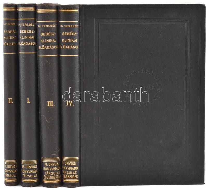 Verebély Tibor: Sebészklinikai előadások. I-IV. köt. Magyar Orvosi Könyvkiadó Társulat CLXXIII., CXXX., CXXXII., CXXXVII. köt. Bp., 1930- 1934, Magyar Orvosi Könyvkiadó Társulat, 8+387 p.+VIII t.;+6+306 p.+VII t.; 4+470 p.+IV t.;4+445+1+1 p.+II t. Rengeteg szövegközti illusztrációval. Kiadói aranyozott egészvászon-kötés, Corvina-kötés, egészen apró kopásnyomokkal a borítókon, egy lapon szakadás, három szennylapon hiánnyal, de alapvetően jó állapotban.