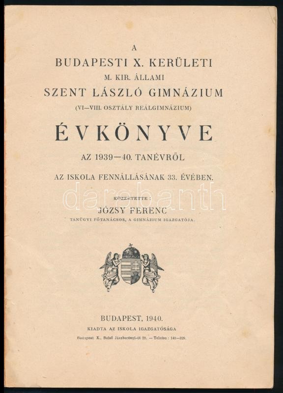 1940 Budapesti X. Kerületi M. Kir. Állami Szent László Gimnázium évkönyve az 1939-40. tanévről. Közzétette: Józsy Ferenc. Bp., 1940., Iskola Igazgatósága,(Stephaneum-ny.) Papírkötés, szakadt borítóval.