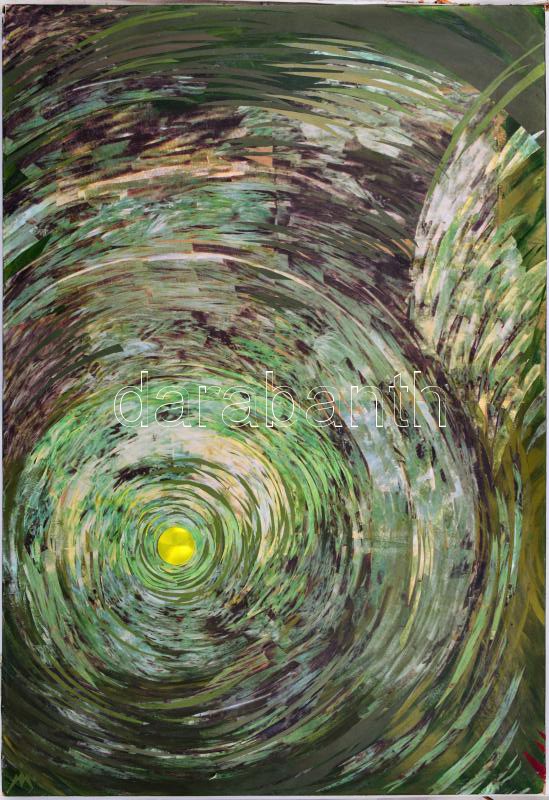 Beschreibung: Illés Márta (?-): Zöld örvény (2007). Olaj, akril, vegyes technika, kollázs, papír, farostra kasírozva, hátodalán címkén feliratozott, szélein kisebb sérülésekkel, 100x70cm