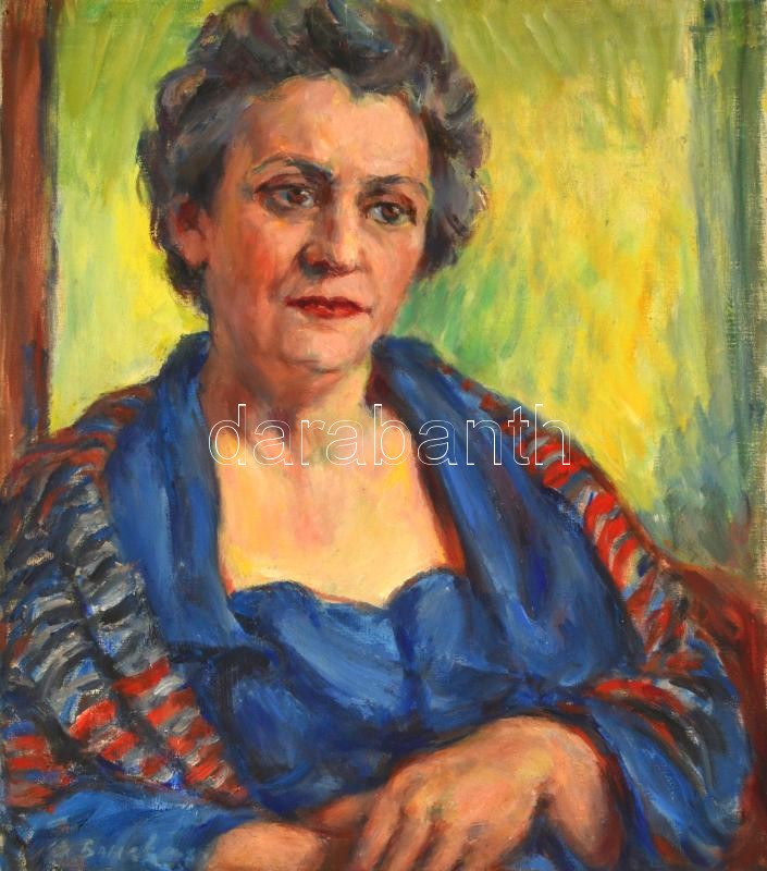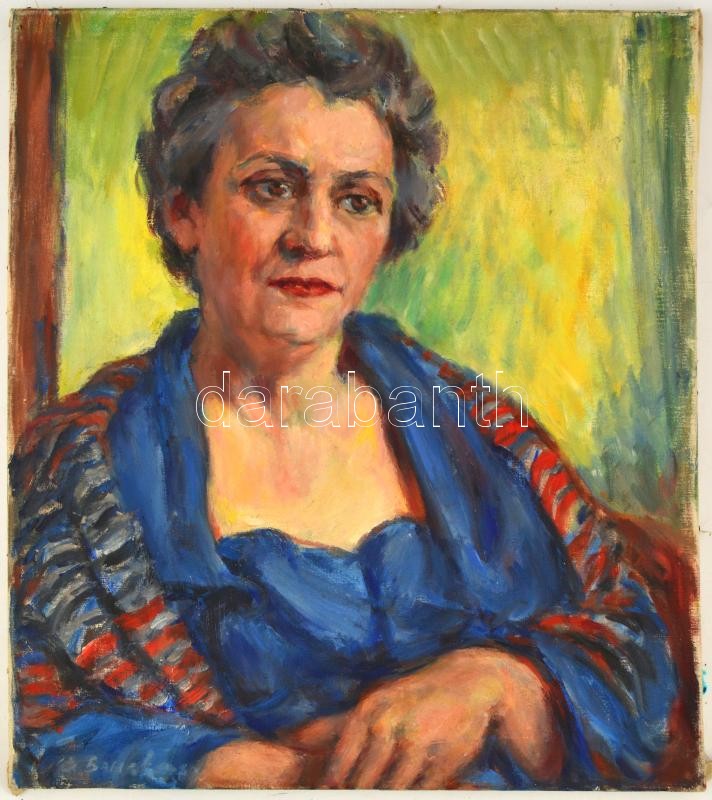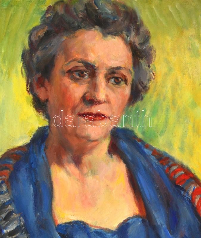 Ismeretlen cirill betűs jelzéssel, feltehetően orosz v. szovjet festő munkája: Női portré. Olaj, vászon, 57×50 cm / Unknown cyrillic sign, probably work of a soviet or russian painter: Portrait of a lady. Oil on canvas, 57x50 cm