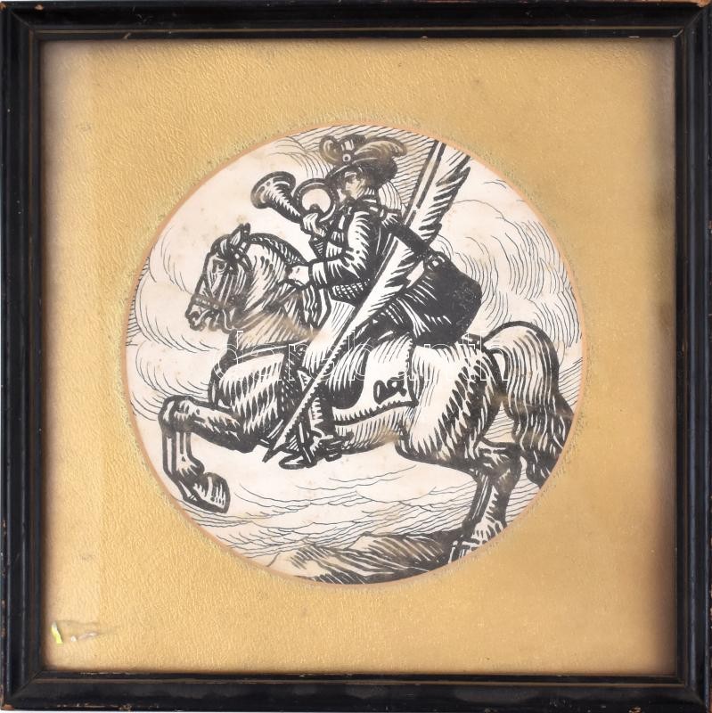 Beschreibung: Jelzés nélkül: A futár. Tus, papír, kissé foltos. Üvegezett fa keretben, d: 17 cm