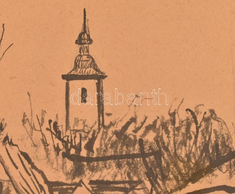 Jelzés nélkül: Falu két templomtoronnyal. Tus, papír.Hátlapján F394, Nemzeti Galéria Bírálat fotó számmal (?) valamint Fényes Adolf felirattal Üvegezett fa keretben. 29x41,5 cm