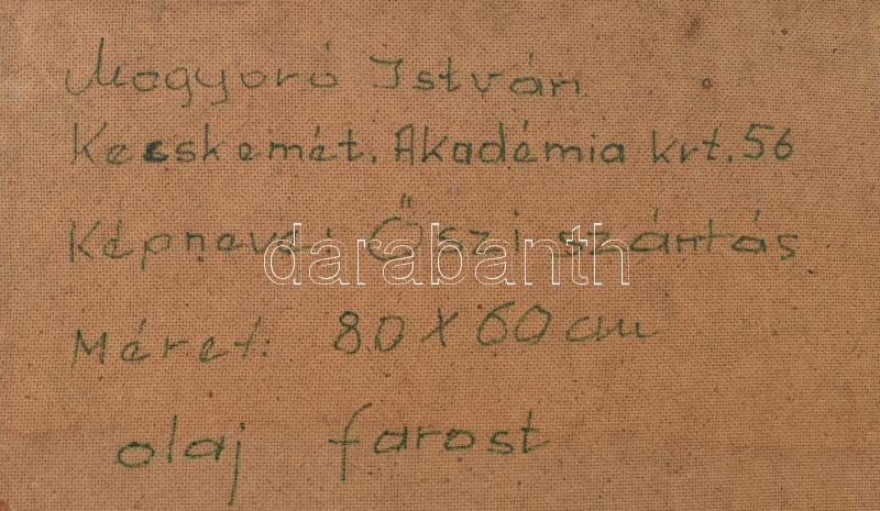 Beschreibung: Mogyorósi István (?-): Őszi szántás. Olaj, farost, jelzett, hátoldalán autográf felirattal és a festő kecskeméti címével, 60x80 cm