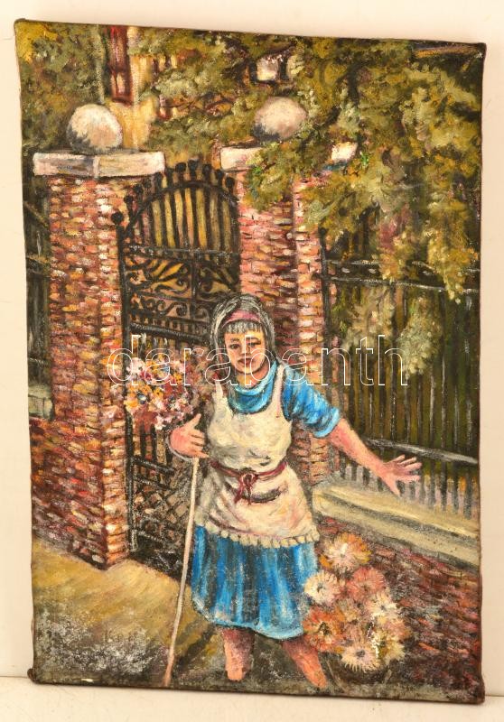 Beschreibung: Olvashatatlan jelzéssel: Lány virágcsokorral. Olaj, vászon, 69×47 cm