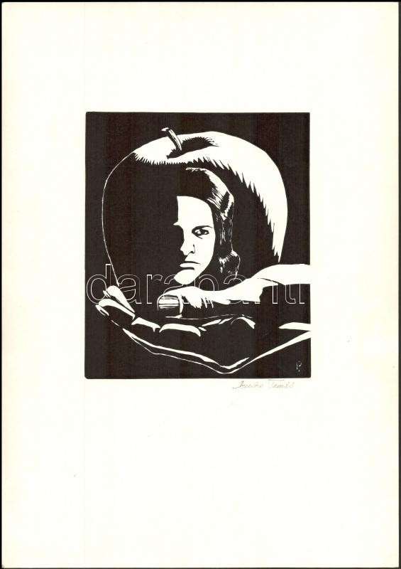 Beschreibung: Olvashatatlan jelzéssel (.. Tamás): A tiltott gyümölcs. Linómetszet, papír, 19,5x16,5 cm