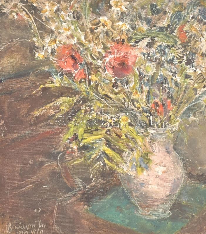 Beschreibung: Olvashatatlan jelzéssel: Virágcsendélet. Olaj, karton, paszpartuban, 31,5×28 cm