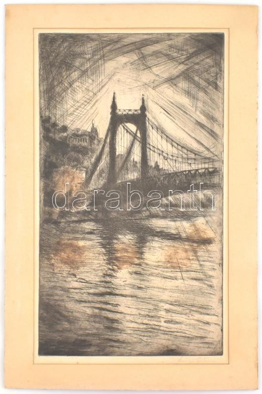 Beschreibung: Szőnyi István (1894-1960): A régi Erzsébet-híd. Rézkarc, papír, jelzett, paszpartuban, 48×27 cm