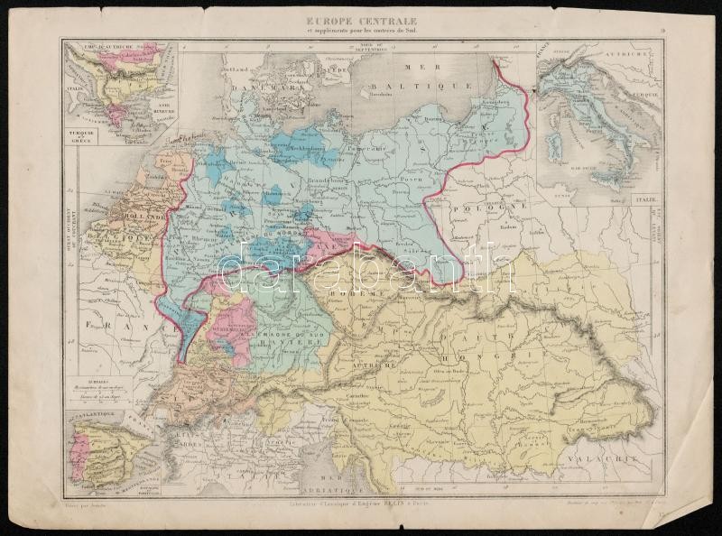 cca 1880 Közép Európa térképe, Europe Centrale et suppléments pour les contrées du Sud, Paris, Librarie Classique d'Eugéne Belin, francia nyelven, színezett rézmetszet, 22x28 cm.