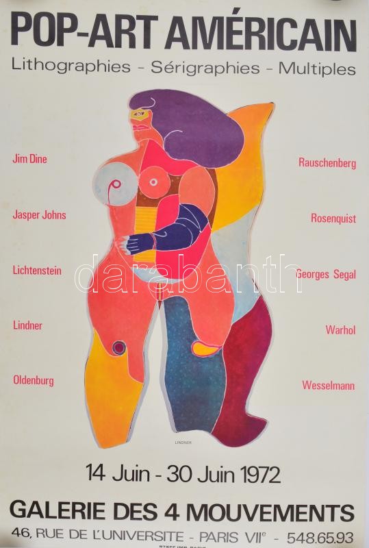 1972 Pop-Art Américain. Jim Dine, Jasper Johns, Lichtenstein, Lindner, Oldenburg, Rauschenberg, Rosenquist, Georges Segal, Warhol, Wesselmann. Kiállítási plakát, ofszet, papír. Apró gyűrődésekkel, feltekerve. 61×39,5 cm