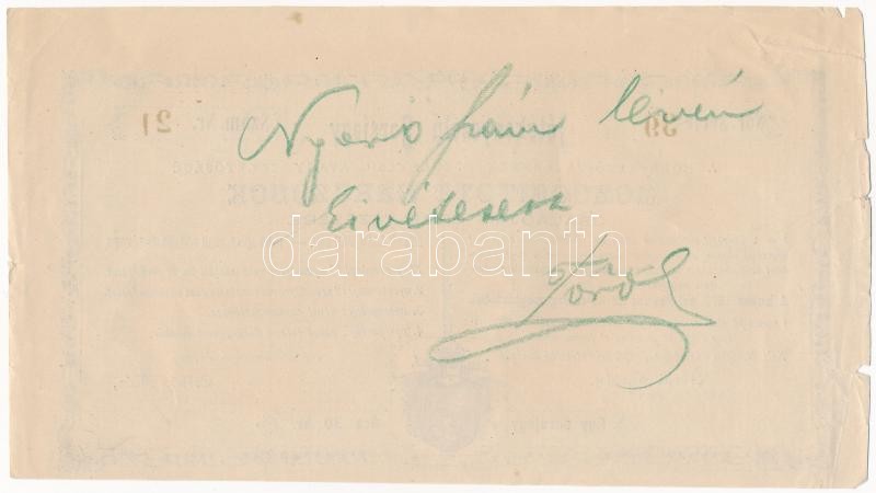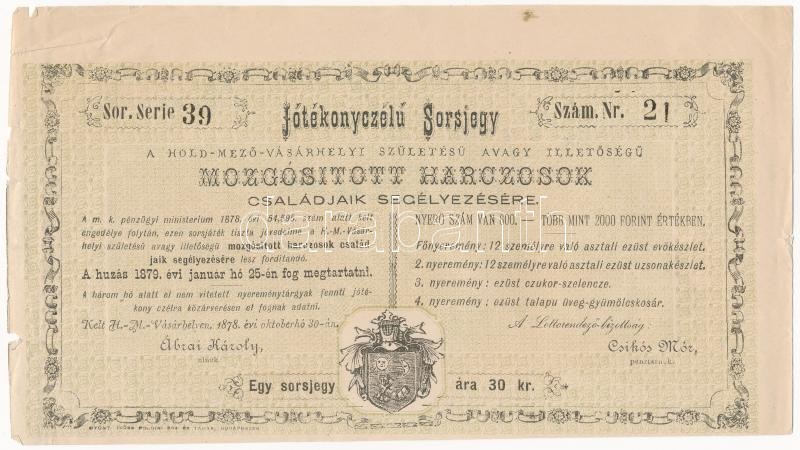 Beschreibung: Hódmezővásárhely 1878. "Jótékonyczélú Sorsjegy - A Hold-Mező-Vásárhelyi Születésű avagy Illetőségű Mozgósított Harczosok Családjaik Segélyezésére" 30kr értékű sorsjegy, hátoldalon ceruzás írás a sorsjegy nyertességéről T:II- kis szakadások a szélén