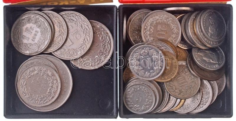 Beschreibung: Svájc - Vegyes fémpénz tétel 2db kis dobozba rendezve, közte 1968-1985. 1Fr Cu-Ni (5x) + 2Fr Cu-Ni (3x) + 5Fr Cu-Ni (br. ~250g) T:vegyes