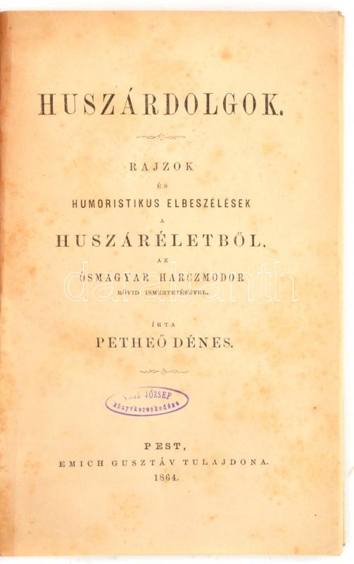 Petheő Dénes: Huszárdolgok. Rajzok és humoristikus elbeszélések huszáréletből, az ősmagyar harczmodor rövid ismertetésével. Pest, 1864, Emich Gusztáv, 293+1 p. Körbevágott, átkötött modern félvászon kötésben.