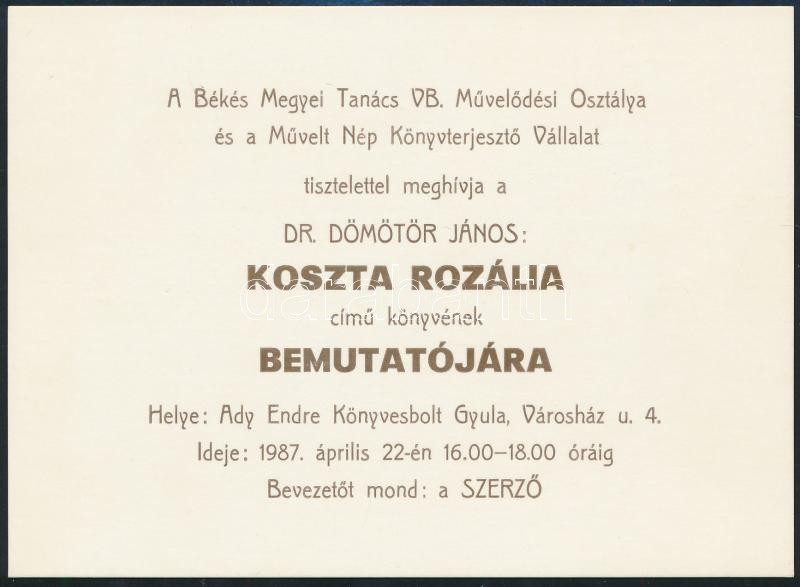 Dömötör János: Koszta Rozália. (Békéscsaba, 1987), Békés Megyei Tanács V.B. Művelődési Osztálya. A szerző és a művész által aláírt. A könyvbemutató meghivójával.