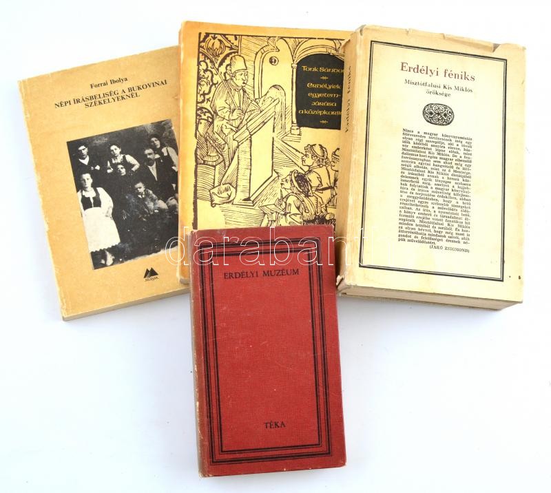 4 db Erdély történelmével kapcsolatos könyv: Forrai: Népi írábeliség a bukovinai székelyeknél, Erdélyi Múzeum, Tank Sándor: Erdélyiek egyetemjárása a középkorban. Erdélyi féniks: Misztótfalusi Kis Miklós öröksége.