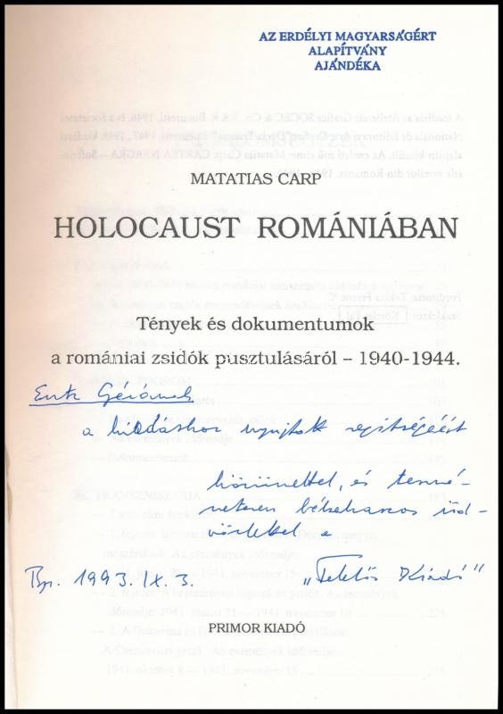 Carp, Matatias: Holocaust Romániában. Tények és dokumentumok a romániai zsidók pusztulásáról - 1940-1944. H.n., Primor Kiadó. Kiadói papírkötés, kissé kopottas állapotban. A felelős kiadó, Atzél Ferenc által Entz Géza (1949- ) történész részére dedikált példány.