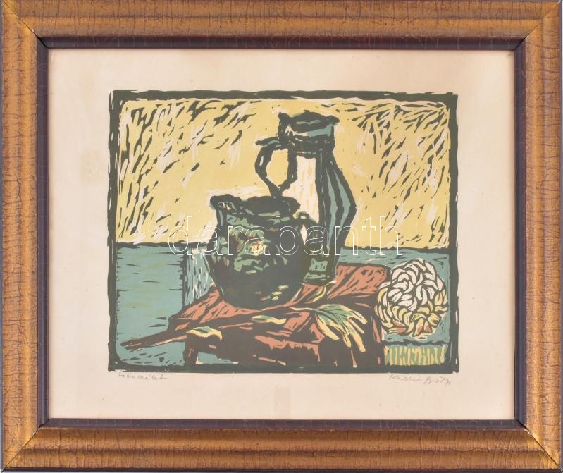 Beschreibung: Kádár György (1912-2002): Csendélet. Színes linómetszet, papír, jelzett, üvegezett fa keretben, 25x33,5 cm