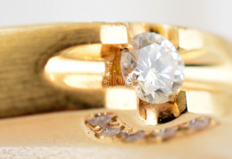 Arany (Au) 14K gyűrű, brill kövekkel, a nagy cca 0,08 ct, a 10 kisebb összesen cca 0,1 ct, jelzett, méret: 53, bruttó: 2,2 g
