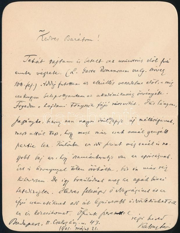 1901 Katona Lajos (1862-1910) néprajzkutató, filológus, irodalomtörténész, az MTA tagja autográf levele melyet akadémikussá választása után írt és melyben humorosan reflektál is erre. Egy beírt oldal.