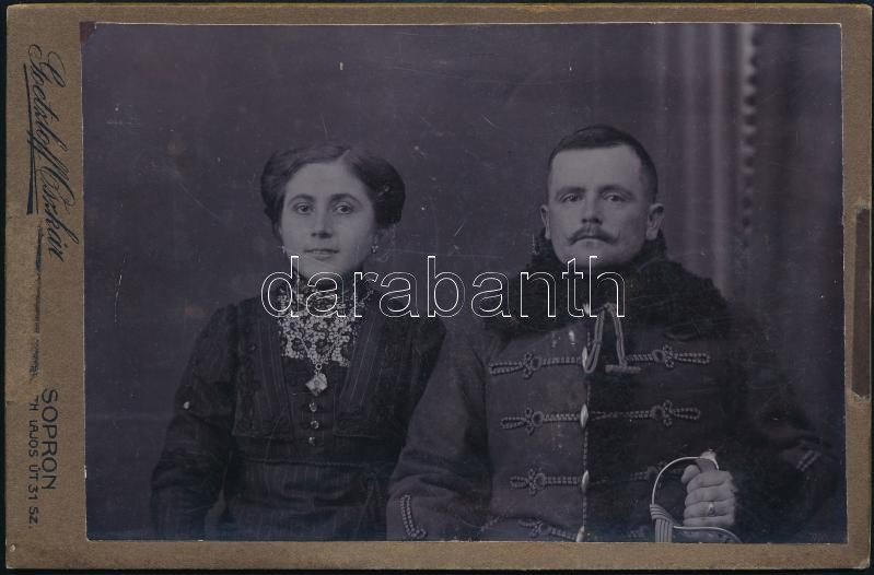 cca 1900 Soproni huszár és felesége, nyakában férje fényképével, kemén... https://www.darabanth.com/de/379-Fernauktion/379.0/Kunst-Dokumente-andere-Sammelgebiete/Militaria~500032/cca-1900-Soproni-huszar-es-felesege-nyakaban-ferje-fenykepevel-kemenyhatu-foto-Goetzlo~II2242684