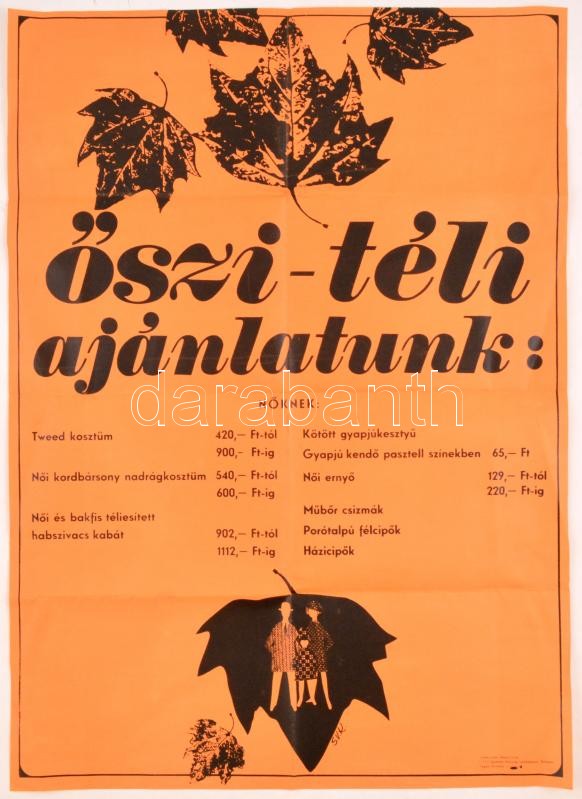 "Őszi-téli ajánlatunk" ruházkodási témájú plakát, jelzett (... https://www.darabanth.com/de/379-Fernauktion/379.0/Kunst-Dokumente-andere-Sammelgebiete/Plakat~500031/Oszi-teli-ajanlatunk-ruhazkodasi-temaju-plakat-jelzett-SVK-hajtott-kis-gyurodC3~II2181430