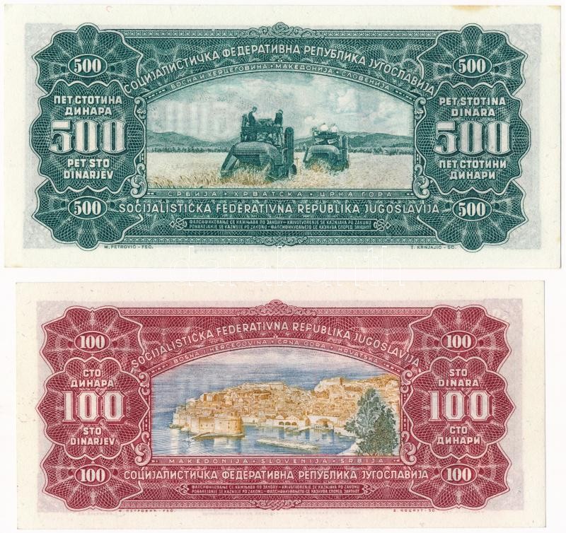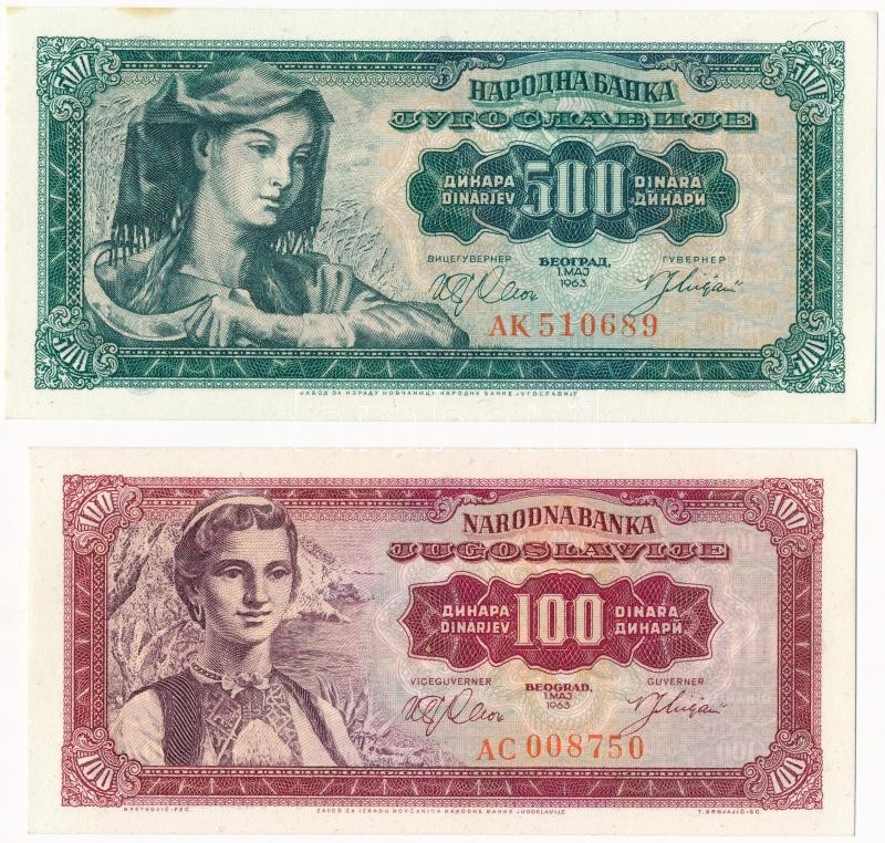 Jugoszlávia 1963. 100D + 500D T:I Yugoslavia 1963. 100 Dinara + 500 Di... https://www.darabanth.com/de/379-Fernauktion/379.0/Numismatik/Weltweit-Banknoten~2000013/Jugoszlavia-1963-100D-plus-500D-TI-Yugoslavia-1963-100-Dinara-plus-500-Dinara-CUNC--Krause-73-74~II2189724