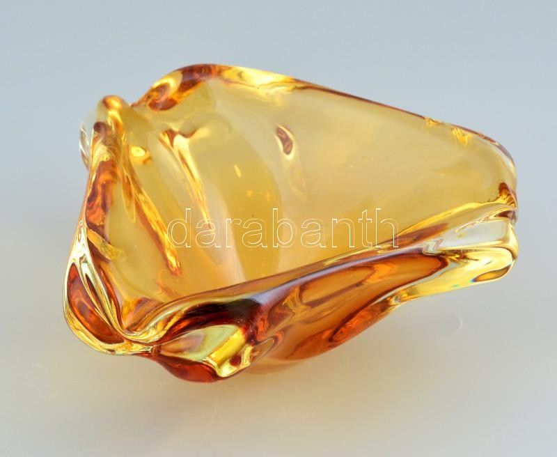 Beschreibung: Cseh borostyán sárga kristályüveg asztalközép. Karcokkal. 19x19 cm