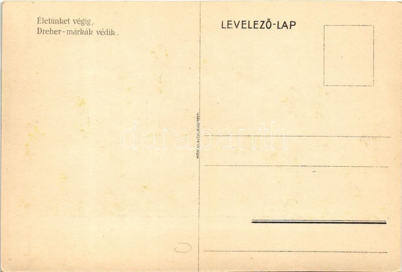 Életünket végig Dreher márkák védik / Hungarian beer advertisement, hu... https://www.darabanth.com/de/38-Gross-Auktion/38.1/Ansichtskarten/Bier-Alkohol-Tabak~15737/Eletunket-vegig-Dreher-markak-vedik-Hungarian-beer-advertisement-humour~II2615886