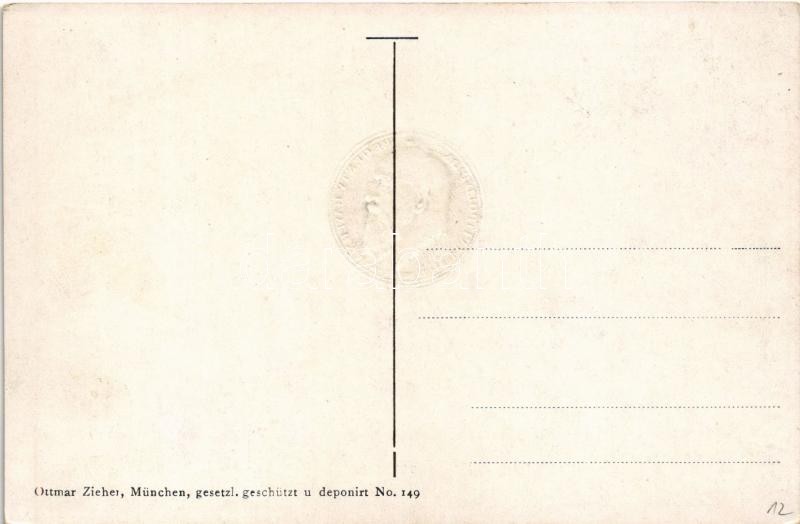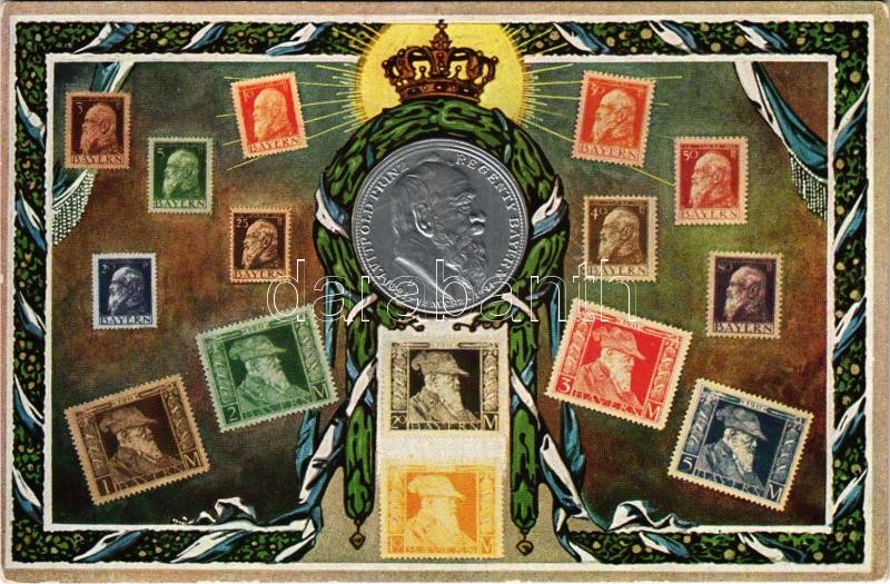 Prinzregent Luitpold von Bayern / Luitpold bajor királyi herceg. Dombornyomott érme és bélyegek / Luitpold, Prince Regent of Bavaria. Embossed coin and stamps.Ottmar Zieher No. 149. Art Nouveau
