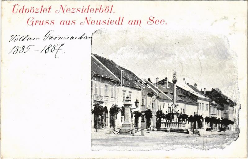 Nezsider, Neusiedl am See; Fő utca, Szentháromság szobor, Franz Wolf üzlete / Hauptstrasse, Dreifaltigkeitsstatue / main street, Trinity statue, shop (Rb)